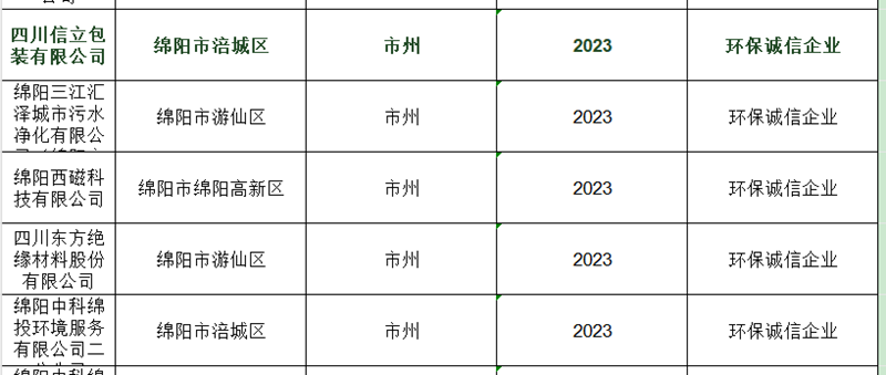 近日,从绵阳市生态环境局发布的关于《绵阳市2023年度市级企业环境信用评价结果公告》中获悉,九游注册获评绵阳市2023年度“环保诚信企业”。