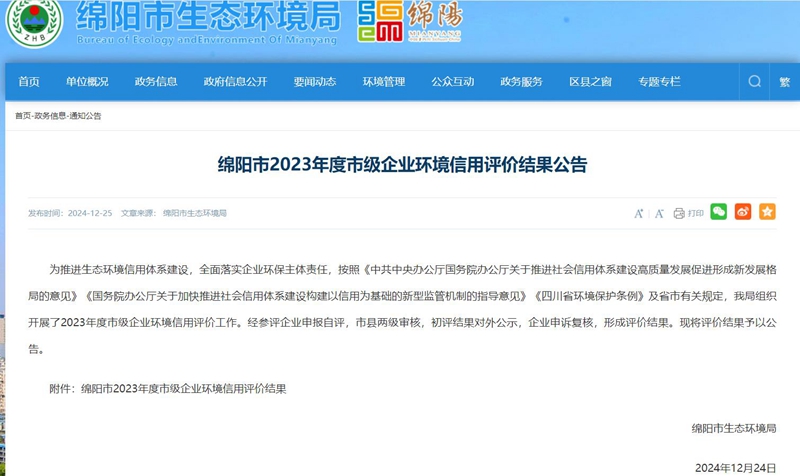 近日,从绵阳市生态环境局发布的关于《绵阳市2023年度市级企业环境信用评价结果公告》中获悉,九游注册获评绵阳市2023年度“环保诚信企业”。